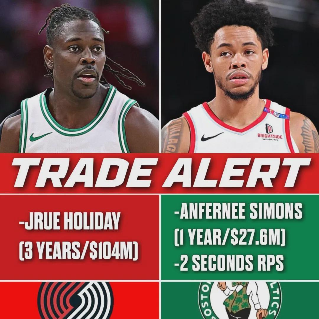 这笔交易本来是1换3,凯尔特人用霍勒迪换来西蒙斯和2个次轮签。开拓者在体检时发现霍勒迪有伤,撤回2个次轮签,交易变成1换1。霍勒迪合同还剩3年1.04亿美元,西蒙斯合同仅剩1年2760万,凯尔特人一举省下4000万奢侈税!